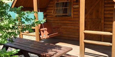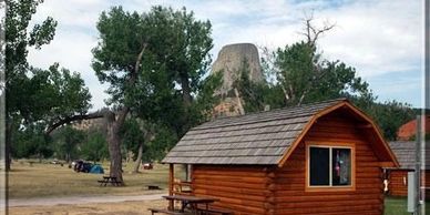 Escape from reality in one of our Patio Kamping Kabins. Each cabin has a single room with a double-sized log bed and futon, as well as a small refrigerator and microwave. Heat and A/C included. Enjoy a stunning view of Devils Tower from the deck swing or your private patio seating area featuring a propane grill and wood firepit. Pet fee.