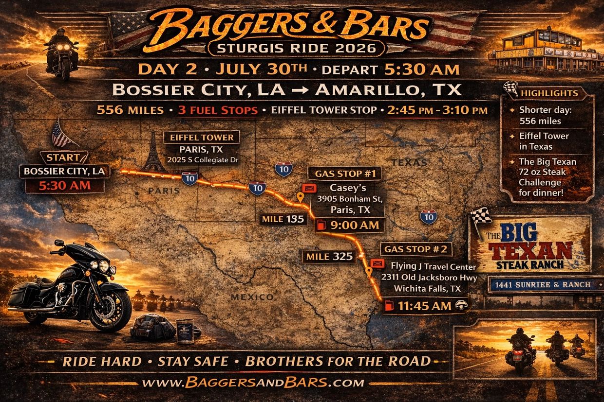 We roll out of Bossier City, Louisiana and head west with a shorter, more relaxed rhythm compared to Day 1’s marathon haul. Today is about steady cruising, wide Texas highways, and enjoying the ride.