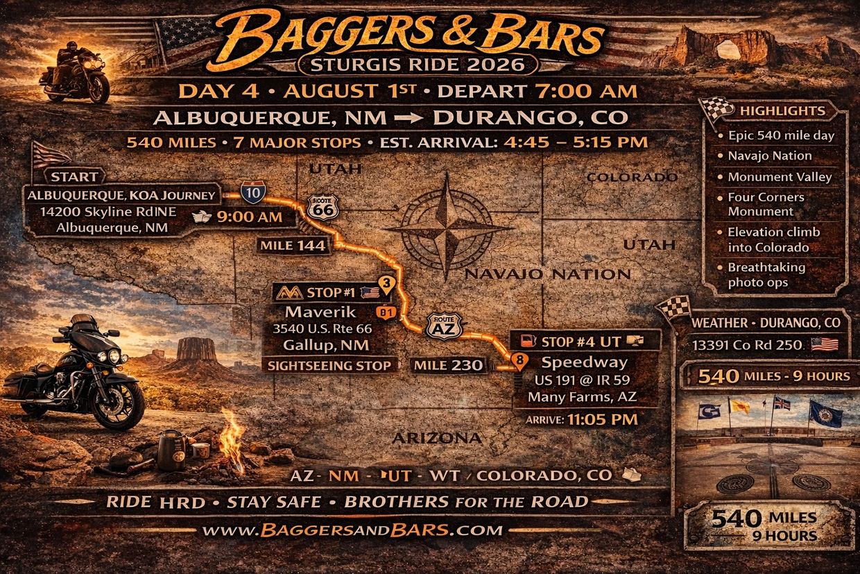 540 miles through Navajo Nation, Monument Valley, Four Corners, and into the Colorado mountains. Window Rock, Forrest Gump Point, Goosenecks, and Durango by nightfall. One of the most scenic days of the entire ride. 🏜️🏍️🔥
