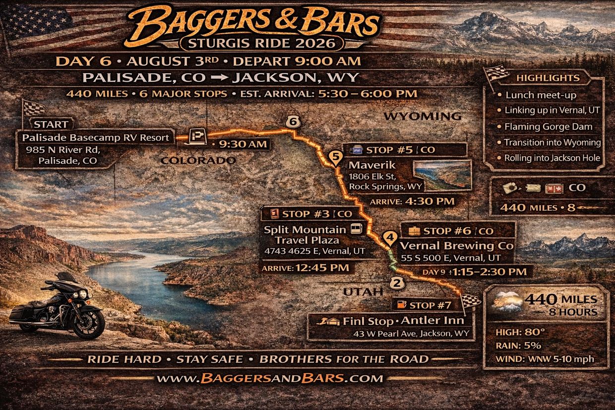 440 miles through Colorado, Utah, and Wyoming. Lunch and meet-up at Vernal Brewing Co, Flaming Gorge views, and a strong push into Jackson. The Tetons are calling. 🏔️🏍️🔥